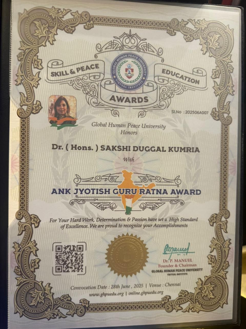 Honoured and humbled to receive the Doctorate of Honours in Numerology — a first of its kind. This recognition is not just mine; it belongs to every soul who believed in me.